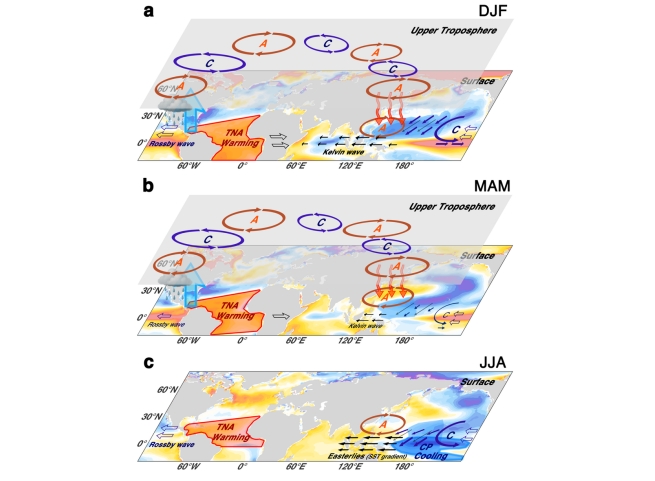 图.全球变暖下三大洋对WNPAC增强的作用机制。(a) 冬季:热带北大西洋增暖(填色)通过三条路径增强WNPAC,包括:向西传播的罗斯贝波(蓝色箭头)、向东传播的开尔文波(黑色箭头),以及由对流增强触发的准定常罗斯贝波列。(b) 春季:热带北大西洋增暖主要通过高空准定常罗斯贝波列维持WNPAC,赤道波作用相对减弱。(c) 夏季:热带北大西洋增暖与中太平洋降温共同作用,通过赤道罗斯贝波动力学和印太暖池—中西太平洋间增强的海温梯度驱动的异常东风,进一步强化WNPAC。