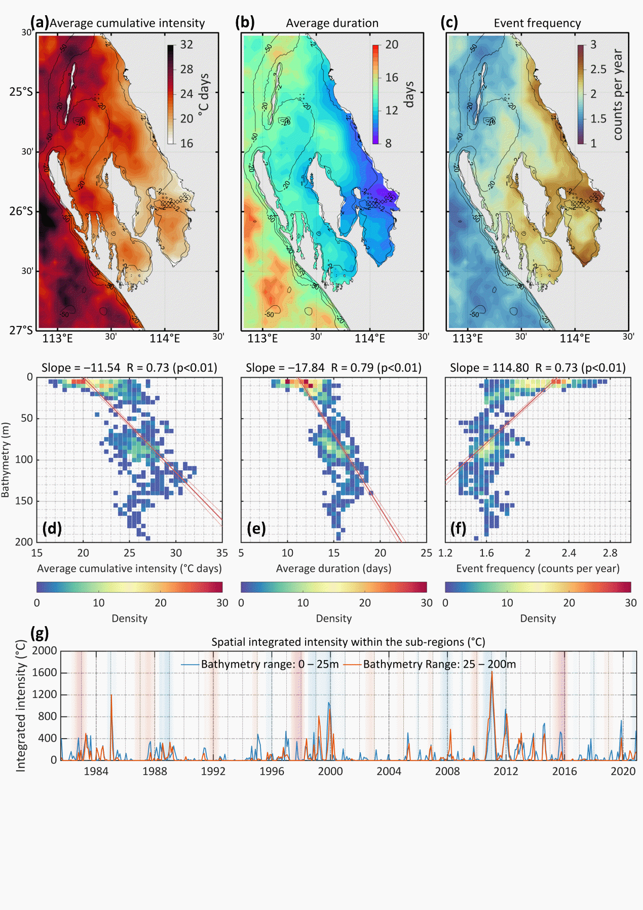 图 1. 鲨鱼湾海洋热浪指标的时空特征。(a‒c)1981–2020 年海洋热浪事件平均累积强度、持续时间和发生频率的空间分布;(d‒f)三者与水深关系的散点密度分布及线性拟合(红色实线,虚线为 95% 置信区间);(g) 湾内(≤ 25 m)与湾外(> 25 m)区域的月平均强度,背景阴影为 NOAA 提供的海洋尼诺指数 (ONI)