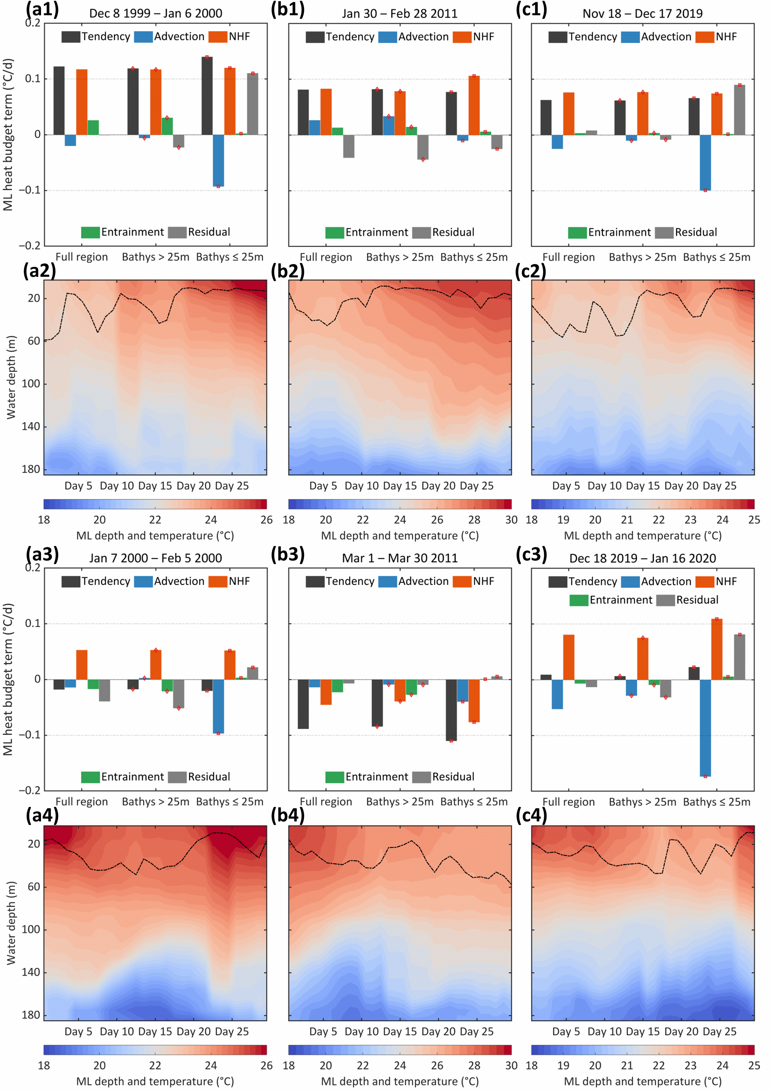 图2. 鲨鱼湾混合层热收支。(a1‒c2) 2000、2011 和 2019 年海洋热浪事件的形成阶段,(a3‒c4)消亡阶段。(a1)2000 年事件形成阶段全区、湾外区域(> 25 m,菱形标记)和湾口区域(≤ 25 m,方形标记)的体积加权温度变化率及水平平流、净热通量、夹卷过程及残差项的贡献;(a2) 同事件的面积加权海洋温度剖面,并叠加混合层深度(MLD,黑色虚线);(a3‒a4)与(a1‒ a2)类似,但为消亡阶段;(b1‒b4)与 (a1‒a4)类似,但对应 2011 年事件的形成阶段与消亡阶段;(c1‒c4) 与(a1‒a4) 类似,但对应 2019 年事件的形成阶段与消亡阶段