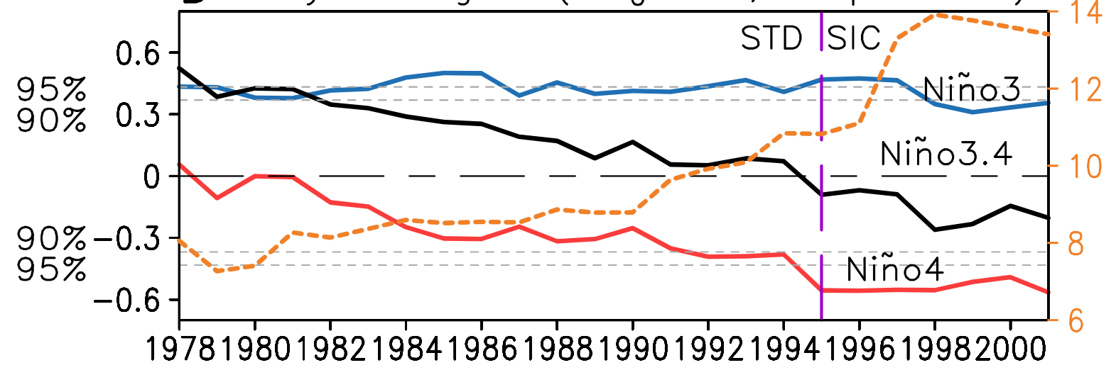 橙色虚线:1–3月(JFM₁)白令海SIC的21年滑动标准差(表征变率强度);黑色实线:前一年夏季(JJA₀)Niño3.4指数与JFM₁白令海SIC的滑动相关系数;蓝色(红色)实线:剔除Niño4(Niño3)影响后,JJA₀ Niño3(Niño4)指数与JFM₁白令海SIC的偏相关系数。