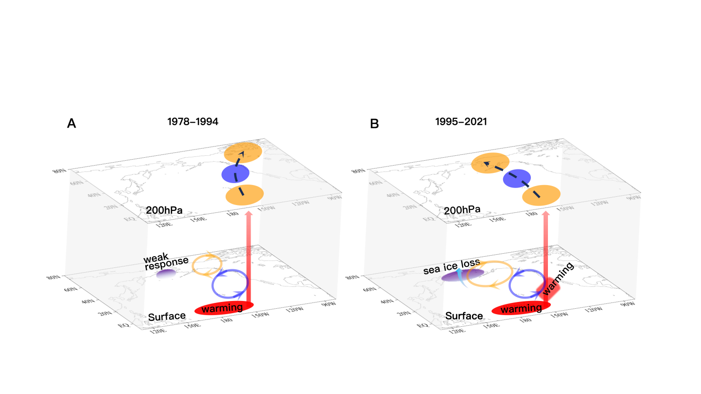 (B) 1995-2021年:中太平洋型厄尔尼诺与正位相NPMM耦合,增强并西移了向极传播的罗斯贝波列。北美西北部及至白令海上空高压异常增强。白令海东部低层反气旋引发持续南风异常,一方面阻碍海冰南输,一方面促进暖湿空气北进,共同造成白令海海冰显著减少。
