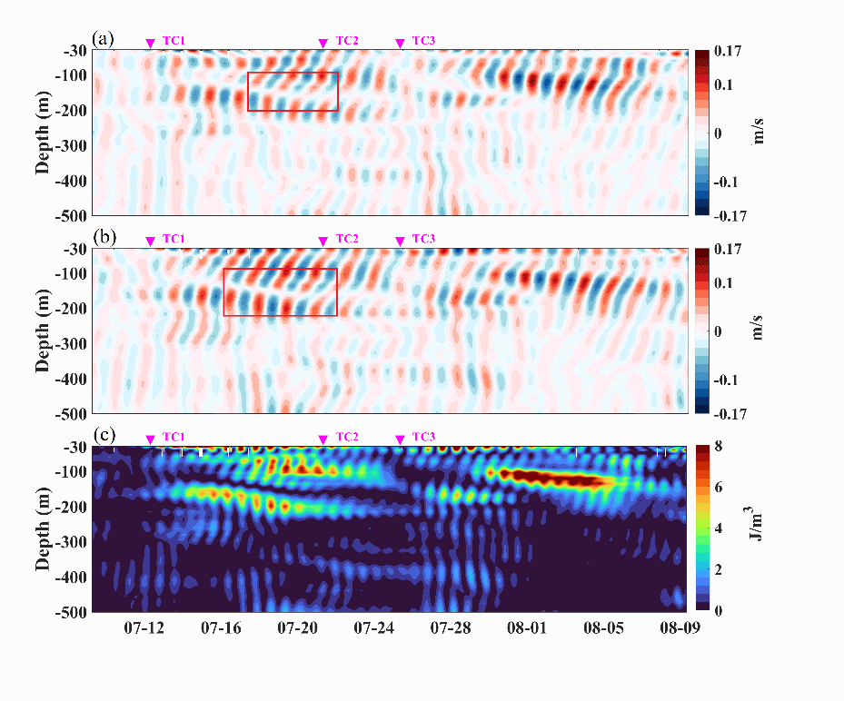 图1.连续台风TC1、TC2和TC3影响下的南海北部近惯性内波的近惯性流速分量及动能的垂向分布