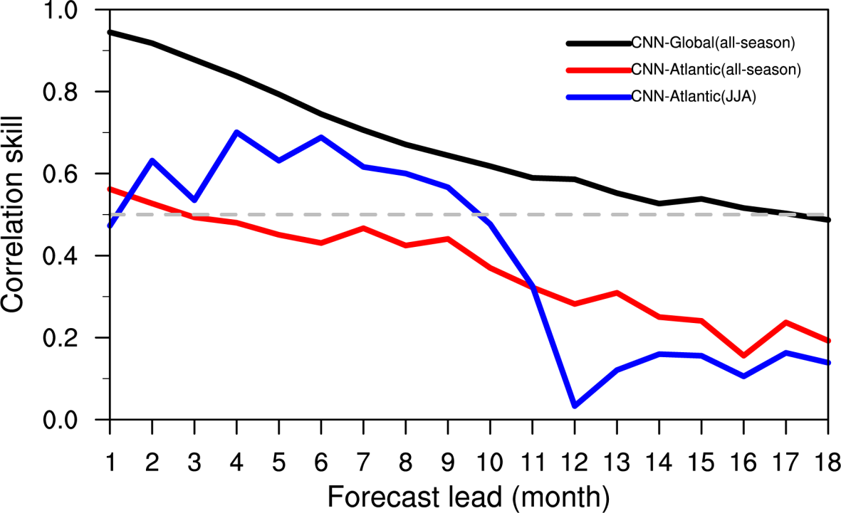 图1 Niño3.4指数的预测技巧随预测超前月数的变化。CNN-Global试验的全季节预测(黑色实线)、CNN-Atlantic试验的全季节预测(红色实线)以及CNN-Atlantic试验中起始于夏季的预测(蓝色实线)。灰色虚线代表0.5,为有效预测技巧的阈值。