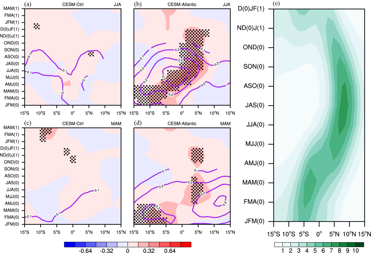 图2 (a) CESM-Ctrl和(b) CESM-Atlantic试验中,回归到夏季热带大西洋海温异常指数的纬向平均(60°W-15°E)降水异常(填色;单位:mm/day)和海温异常(紫色等值线;单位:K)的演变。降水异常超过95%置信水平的区域用黑点表示。仅显示海温异常超过95%置信水平的部分。(c), (d)与(a), (b)类似,但为春季热带大西洋海温异常指数的回归结果。(e) CESM-Atlantic试验中纬向平均(60°W-15°E)的气候态降水演变(单位:mm/day)。
